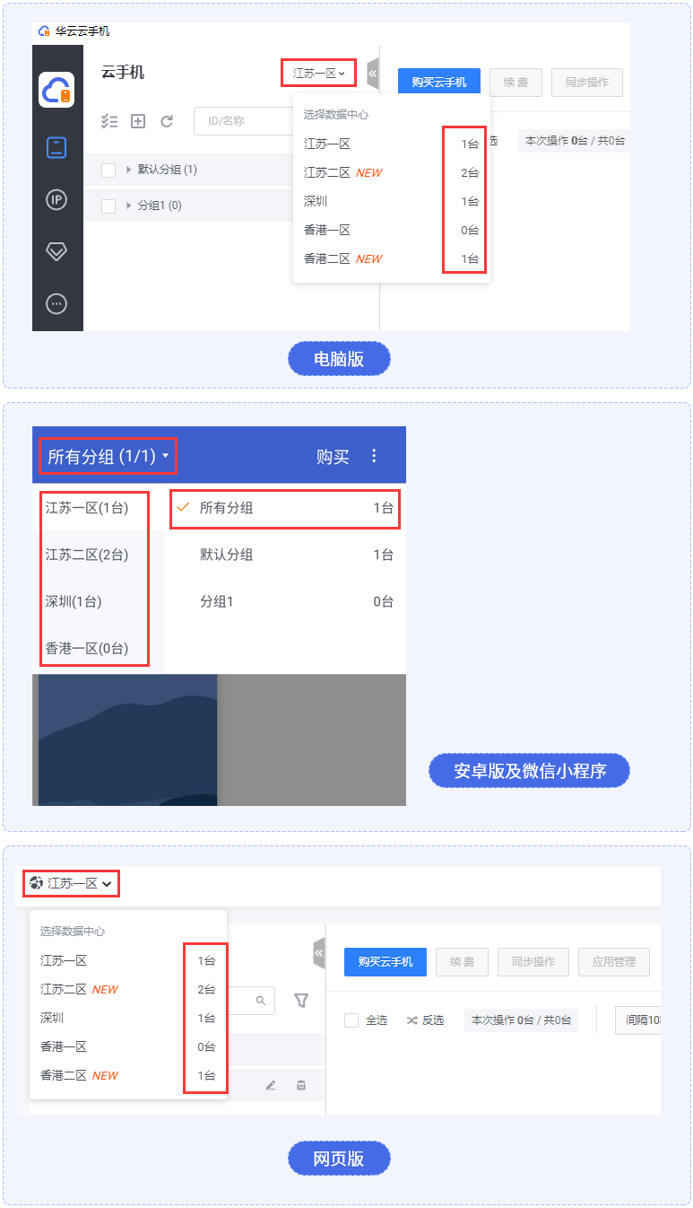 安卓版APP:支援安卓系統手機,隨時管理海量雲手機,支援批次管理功能。除了官網下載,也可以從各大應用市場安裝。