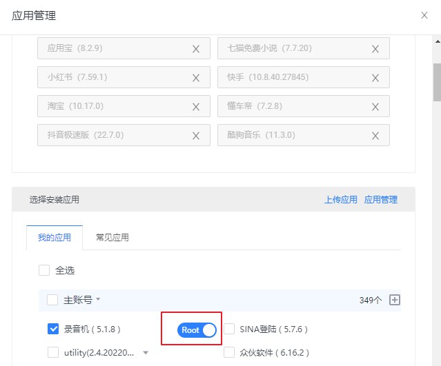 江蘇二區、福建一區、香港二區的雲手機在安裝應用視窗,選中某個應用後可以看到Root開關,如圖