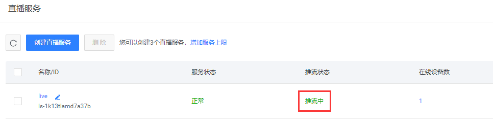 此時在電腦版或網頁版的直播管理面板上看到對應直播服務的推流狀態為【推流中】,即表示系統有正常接收到推流畫面;