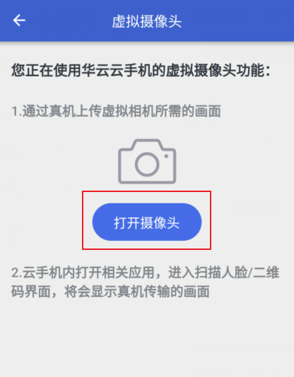 在推流連結關聯的雲手機內開啟APP,進入到直播/掃碼介面,就能從雲手機的攝像頭獲取到畫面;
